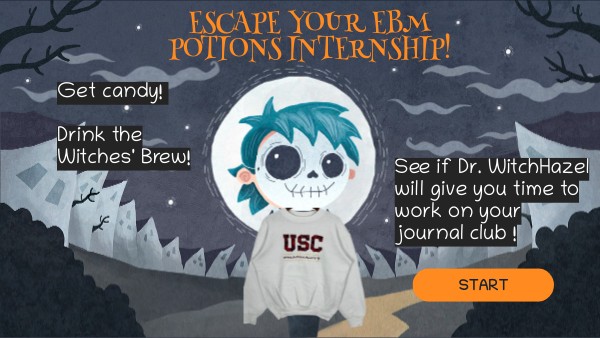 You've got your pumpkin cauldron ready to brew the scariest potions for Dr. Belladonna WitchHazel (Dr. Witch for short). But she is always quizzing you on EBM concepts! Can you survive the night AND get time to work on your journal club? Navigate Dr. Witch's puzzles fastest to win her prized Witches' Brew! đđ»đŹ
