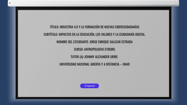 Título: Industria 4.0 y la formación de nuevas ciberciudadanías Subtítulo: Impactos en la educación, los valores y la ciudadanía digital. Nombre del estudiante: Jorge Enrique Salazar Estrada Curso: ANTROPOLOGYA CYBORG Tutor (a): JOHNNY ALEXANDER URIBE Universidad Nacional Abierta y a Distancia – UNAD
