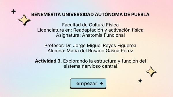 BENEMÉRITA UNIVERSIDAD AUTÓNOMA DE PUEBLA Facultad de Cultura Física Licenciatura en: Readaptación y activación física Asignatura: Anatomía Funcional Profesor: Dr. Jorge Miguel Reyes Figueroa Alumna: María del Rosario Gasca Pérez Actividad 3. Explorando la estructura y función del sistema nervioso central