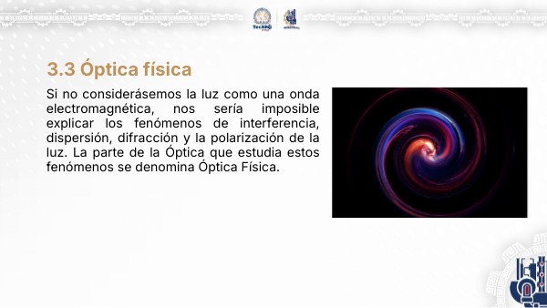 Si no considerásemos la luz como una onda electromagnética, nos sería imposible explicar los fenómenos de interferencia, dispersión, difracción y la polarización de la luz. La parte de la Óptica que estudia estos fenómenos se denomina Óptica Física.