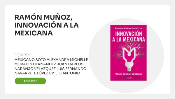 - https://www.emprendices.co/resumen-del-libro-innovacion-la-mexicana-mas-alla-romper-paradigmas/#:~:text=%C2%ABInnovaci%C3%B3n%20a%20la%20mexicana%C2%BB%20es%20un%20libro%20escrito,habilidades%20necesarias%20para%20llevar%20sus%20ideas%20al%20%C3%A9xito.