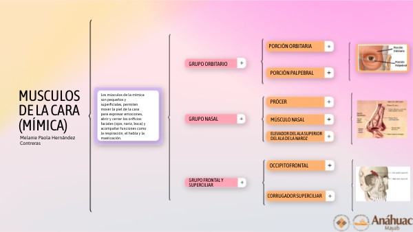 Los músculos de la mímica son pequeños y superficiales, permiten mover la piel de la cara para expresar emociones, abrir y cerrar los orificios faciales (ojos, nariz, boca) y acompañar funciones como la respiración, el habla y la masticación.