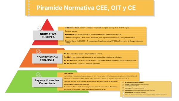 Instituciones Clave: Comisión Europea, Parlamento Europeo, Consejo de la Unión Europea. Tipos de normas: Reglamentos: De aplicación directa e inmediata en todos los Estados miembros. Directivas: Obligan al Estado en los resultados, pero requieren transposición a la legislación interna. Directiva Marco 89/391/CEE → Transpuesta en España como Ley 31/1995 de Prevención de Riesgos Laborales (LPRL).