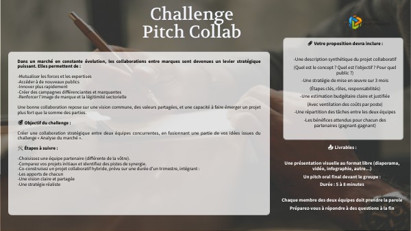 Dans un marché en constante évolution, les collaborations entre marques sont devenues un levier stratégique puissant. Elles permettent de : -Mutualiser les forces et les expertises -Accéder à de nouveaux publics -Innover plus rapidement -Créer des campagnes différenciantes et marquantes -Renforcer l’image de marque et la légitimité sectorielle Une bonne collaboration repose sur une vision commune, des valeurs partagées, et une capacité à faire émerger un projet plus fort que la somme des parties. 🎯 Objectif du challenge : Créer une collaboration stratégique entre deux équipes concurrentes, en fusionnant une partie de vos idées issues du challenge « Analyse du marché ». 🛠️ Étapes à suivre : -Choisissez une équipe partenaire (différente de la vôtre). -Comparez vos projets initiaux et identifiez des pistes de synergie. -Co-construisez un projet collaboratif hybride, prévu sur une durée d’un trimestre, intégrant : -Les apports de chacun -Une vision claire et partagée -Une stratégie réaliste