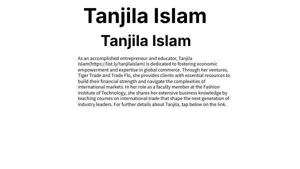 As an accomplished entrepreneur and educator, Tanjila Islam(https://list.ly/tanjilaislam) is dedicated to fostering economic empowerment and expertise in global commerce. Through her ventures, Tiger Trade and Trade Flo, she provides clients with essential resources to build their financial strength and navigate the complexities of international markets. In her role as a faculty member at the Fashion Institute of Technology, she shares her extensive business knowledge by teaching courses on international trade that shape the next generation of industry leaders. For further details about Tanjila, tap below on the link.