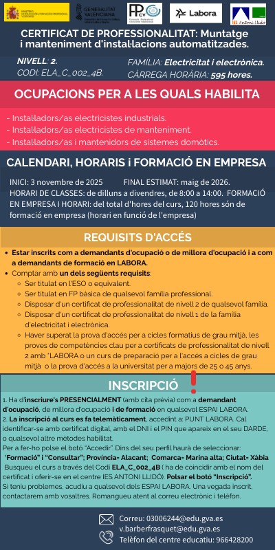 1. Ha d'inscriure's PRESENCIALMENT (amb cita prèvia) com a demandant d'ocupació, de millora d'ocupació i de formació en qualsevol ESPAI LABORA. 2. La inscripció al curs es fa telemàticament, accedint a: PUNT LABORA. Cal identificar-se amb certificat digital, amb el DNI i el PIN que apareix en el seu DARDE, o qualsevol altre mètodes habilitat. Per a fer-ho polse el botó “Accedir”. Dins del seu perfil haurà de seleccionar: “Formació” i “Consultar”; Província= Alacant; Comarca= Marina alta; Ciutat= Xàbia Busqueu el curs a través del Codi ELA_C_002_4B ( ha de coincidir amb el nom del certificat i oferir-se en el centre IES ANTONI LLIDÓ). Polsar el botó “Inscripció”. Si teniu problemes, acudiu a qualsevol dels ESPAI LABORA. Una vegada inscrit, contactarem amb vosaltres. Romangueu atent al correu electrònic i telèfon.