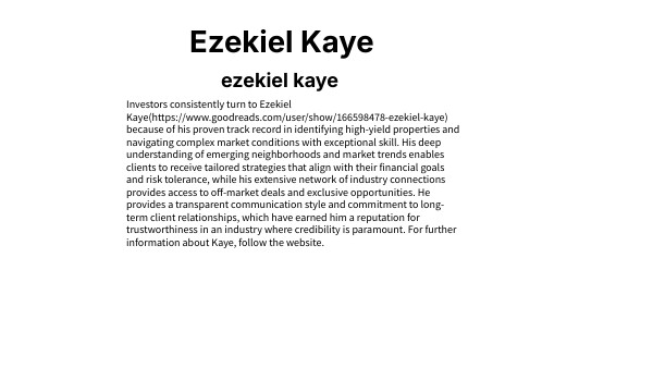 Investors consistently turn to Ezekiel Kaye(https://www.goodreads.com/user/show/166598478-ezekiel-kaye) because of his proven track record in identifying high-yield properties and navigating complex market conditions with exceptional skill. His deep understanding of emerging neighborhoods and market trends enables clients to receive tailored strategies that align with their financial goals and risk tolerance, while his extensive network of industry connections provides access to off-market deals and exclusive opportunities. He provides a transparent communication style and commitment to long-term client relationships, which have earned him a reputation for trustworthiness in an industry where credibility is paramount. For further information about Kaye, follow the website.