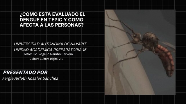 ¿Qué es el dengue? Enfermedad viral transmitida por mosquitos del género Aedes, principalmente Aedes aegypti. Se transmite cuando un mosquito infectado pica a una persona. El mosquito desarrolla el virus después de alimentarse de alguien con dengue. Hay varios serotipos del virus, lo que complica la inmunidad: infectarse por uno no da protección completa contra los otros. En Nayarit han empezado a circular serotipos más nuevos, lo que puede aumentar la gravedad de los brotes. Síntomas Algunos de los síntomas del dengue son: Fiebre alta (frecuentemente súbita) Dolor de cabeza intenso, especialmente detrás de los ojos Dolores musculares y articulares Náuseas, vómitos Erupciones cutáneas, enrojecimiento de piel En casos más graves: signos de alarma como sangrado (nariz o encías), shock, complicaciones que requieren hospitalización. Factores que contribuyen al brote en Tepic Clima: temporada de lluvias favorece acumulación de agua estancada → criaderos del mosquito. Lugares propensos: patios, azoteas, objetos descartados (cacharros), drenajes, zonas con basura o agua acumulada, también escuelas, iglesias, panteones. Serotipos nuevos: la aparición de serotipos menos comunes o nuevos para la población, que podrían ocasionar síntomas más graves o mayor mortalidad. Participación comunitaria insuficiente: en algunos casos, resistencia o poca colaboración en las labores de fumigación, descacharrización, limpieza; falta de conciencia. Medidas de prevención y control Para que tu presentación quede bien completa, esto es lo que se está haciendo y lo que se recomienda: Campañas de descacharrización: eliminar recipientes con agua, limpiar patios, azoteas, jardines. Control larvario: destruir o tratar criaderos donde se reproducen las larvas. Nebulización y fumigación para matar mosquitos adultos.