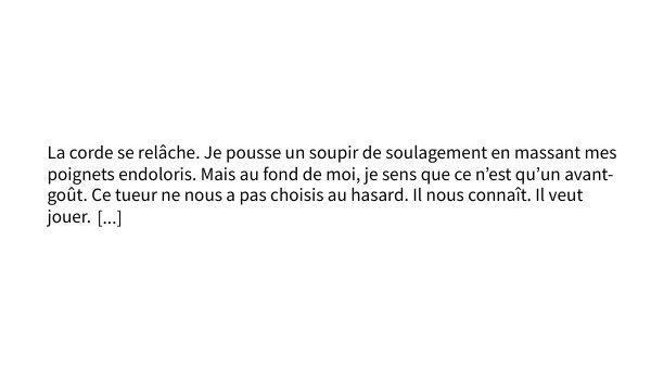 La corde se relâche. Je pousse un soupir de soulagement en massant mes poignets endoloris. Mais au fond de moi, je sens que ce n’est qu’un avant-goût. Ce tueur ne nous a pas choisis au hasard. Il nous connaît. Il veut jouer.