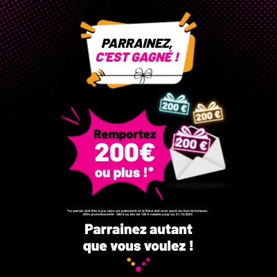 *Le parrain doit être à jour dans ses paiements et le filleul doit avoir payé ses frais techniques.Offre promotionnelle : 200 € au lieu de 100 € valable jusqu'au 31/12/2025