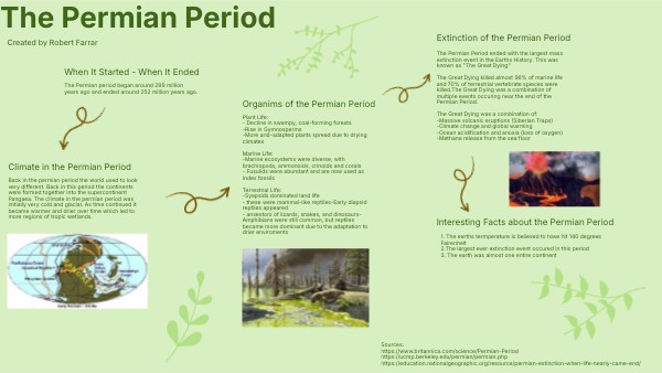 Sources: https://www.britannica.com/science/Permian-Period https://ucmp.berkeley.edu/permian/permian.php https://education.nationalgeographic.org/resource/permian-extinction-when-life-nearly-came-end/