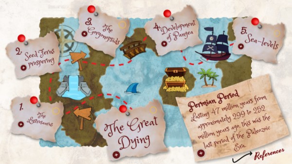 “Permian Period.” The Columbia Encyclopedia 2018: n. pag. Print Khasanov, R, and Yu Balabanov. “Paleogeographic Causes of the Formation of Mineral Deposits on the East of the East European Platform in the Permian Period.” IOP conference series. Earth and environmental science 516.1 (2020): 12008. Web. Sussex Business Solutions . (n.d.). Permian period - Q-files - Search • read • discover. https://www.q-files.com/prehistoric/early-life/permian-period#:~:text=During%20the%20Permian%20Period%20(299,ruled%20supreme%20in%20the%20oceans. Permian period—298.9 to 251.9 MYA (U.S. National Park Service). (n.d.). https://www.nps.gov/articles/000/permian-period.htm Ross, A, C., Ross, & RP, J. (1999, July 26). Permian Period | Plants, Animals, Extinction, & Facts. Encyclopedia Britannica. https://www.britannica.com/science/Permian-Period/Mass-extinction