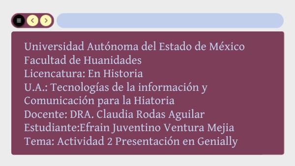 Universidad Autónoma del Estado de MéxicoFacultad de Huanidades Licencatura: En Historia U.A.: Tecnologías de la información y Comunicación para la Hiatoria Docente: DRA. Claudia Rodas Aguilar Estudiante:Efrain Juventino Ventura Mejia Tema: Actividad 2 Presentación en Genially