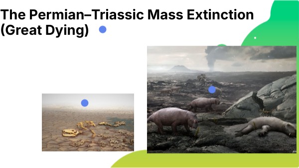 Name of time / event: Permian–Triassic Mass Extinction (often called the “Great Dying”) When it happened: ~252 million years ago How long it lasted: The main extinction happened over tens to hundreds of thousands of years), Type of division: It’s an event/ boundary World