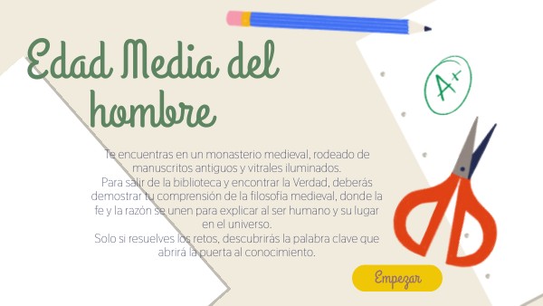 Te encuentras en un monasterio medieval, rodeado de manuscritos antiguos y vitrales iluminados. Para salir de la biblioteca y encontrar la Verdad, deberás demostrar tu comprensión de la filosofía medieval, donde la fe y la razón se unen para explicar al ser humano y su lugar en el universo. Solo si resuelves los retos, descubrirás la palabra clave que abrirá la puerta al conocimiento.