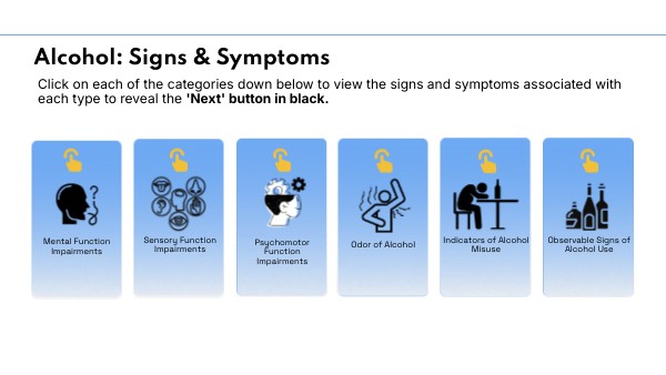 Click on each of the following categories down below to learn about the performance indicators of drug or alcohol use to reveal the 'Next' button in black.