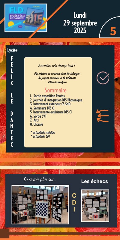 Nous avons communiqué sur la sortie à la Gacilly, sur la journée d'intégration de la chorale, sur le séminaire des BTS CI, sur les parties d'échecs au lycée et sur les intervenants extérieurs