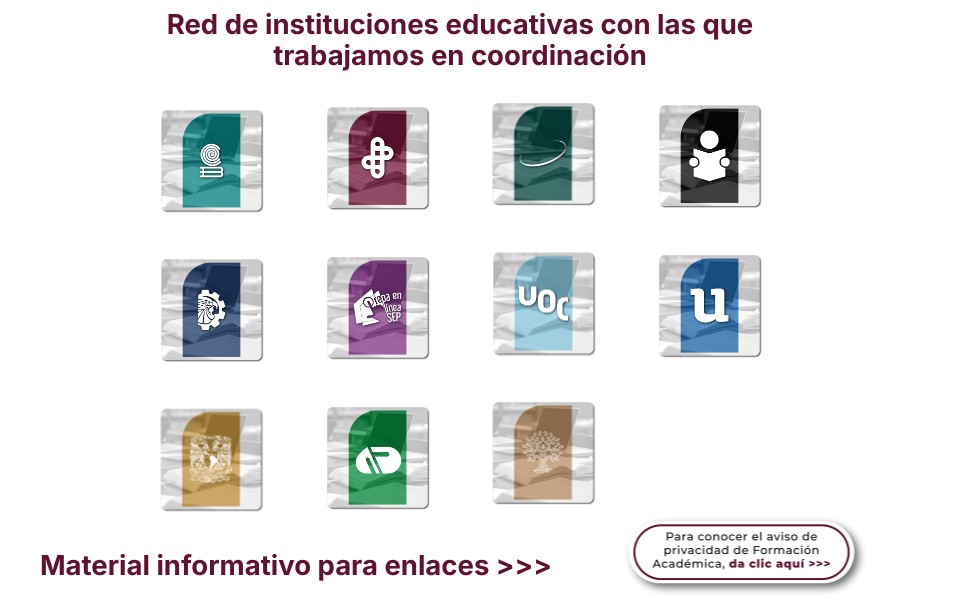 En este espacio podrás acceder a los recursos necesarios para la difusión y seguimiento de actividades de la Promoción de la formación académica: Repositorio de banners: Descarga cada mes el material gráfico disponible para las campañas de difusión. Formatos: Descarga aquí los formatos de reportes trimestrales y ejemplos de difusión mensual. Calendario: Consulta las fechas de convocatorias vigentes de las instituciones educativas y de las reuniones informativas de la oferta académica. Todo el material se encuentra organizado para facilitar su consulta y asegurar una comunicación clara y oportuna.