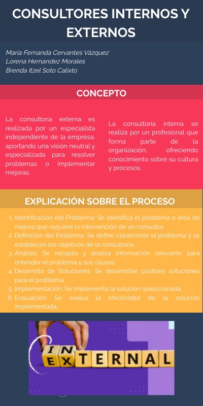 Ejemplo: Un consultor interno de recursos humanos que ayuda a desarrollar programas de capacitación para empleados.- Consultores Externos: Son profesionales independientes o parte de una empresa de consultoría que se contratan para resolver problemas específicos.
