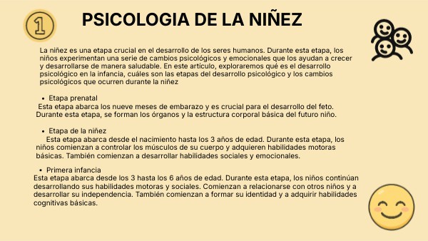 Esta etapa abarca los nueve meses de embarazo y es crucial para el desarrollo del feto. Durante esta etapa, se forman los órganos y la estructura corporal básica del futuro niño.- Etapa de la niñez