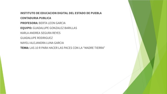 INSTITUTO DE EDUCACION DIGITAL DEL ESTADO DE PUEBLA CONTADURIA PUBLICA PROFESORA: BERTA LEON GARCIA EQUIPO: GUADALUPE GONZALEZ BARILLAS KARLA ANDREA SEGURA REYES GUADALUPE RODRIGUEZ NAYELI ALEJANDRA LUNA GARCIA TEMA: LAS 10 R PARA HACER LAS PACES CON LA “MADRE TIERRA”
