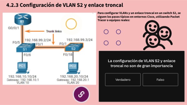 Para configurar VLANs y un enlace troncal en un switch S2, se siguen los pasos típicos en entornos Cisco, utilizando Packet Tracer o equipos reales: