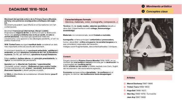 Moviment del període entorn de la Primera Guerra Mundial, pertany a les primeres avantguardes artístiques del segle XX.Moviment precedent i que influirà en el Surrealisme i en l'art contemporani. Moviment transversal intel·lectual, literari i estètic. Proposava la negació de tot, la destrucció per la destrucció. Tenen una postura nihilista (res no té un sentit, ni valor o veritat absoluta), irracional que questionen totes les convencions i una oposició a les ideologies existents, a l'art i la política tradicional. 1918 TristanTzara escrigué manifest dadà considerat un dels més importants entre els escrits del moviment. El moviment dadaista és un moviment antiartísitc, antiliterari i antipoètic perquè qüestona l'existència de l'art, la literatura i la poesia. De fet, per definició, qüestiona el propi Dadaisme. Estan contra la bellesa eterna, els principis preestablerts, la lògica i la immobilitat del pensament. Aposten per la llibertat de l'individu, l'espontaneïtat, l'immediat, actual i aleatori. Defensen el caos contra l'ordre. Formes expressives són el gest, l'escàndol, la provocació. Buscaven impactar o deixar perplex al públic. Al 1924 el «Manifeste du surréalisme» d'André Breton posa fi al moviment.