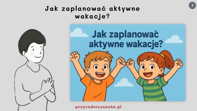 Podział na zespoły i instrukcja zadania – klasa dzieli się na 3–4‑osobowe grupy. Każda grupa otrzymuje arkusz papieru i mazaki. Zadaniem jest zaplanowanie dwudniowego programu aktywnych wakacji w swojej okolicy lub wymyślonej krainie. Plan powinien zawierać: