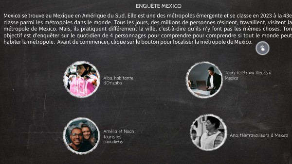 Mexico se trouve au Mexique en Amérique du Sud. Elle est une des métropoles émergente et se classe en 2023 à la 43e classe parmi les métropoles dans le monde. Tous les jours, des millions de personnes résident, travaillent, visitent la métropole de Mexico. Mais, ils pratiquent différement la ville, c'est-à-dire qu'ils n'y font pas les mêmes choses. Ton objectif est d'enquêter sur le quotidien de 4 personnages pour comprendre pour comprendre si tout le monde peut habiter la métropole. Avant de commencer, clique sur le bouton pour localiser la métropole de Mexico.