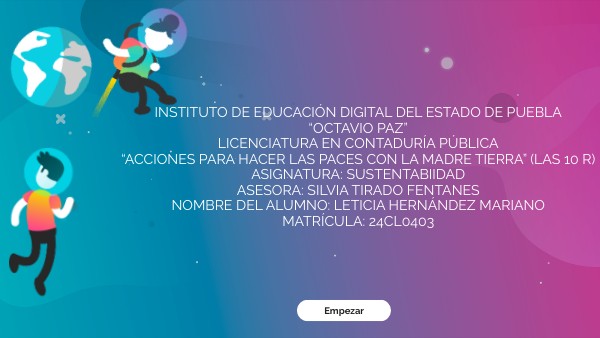 INSTITUTO DE EDUCACIÓN DIGITAL DEL ESTADO DE PUEBLA “OCTAVIO PAZ” LICENCIATURA EN CONTADURÍA PÚBLICA “ACCIONES PARA HACER LAS PACES CON LA MADRE TIERRA” (LAS 10 R) ASIGNATURA: SUSTENTABIIDAD ASESORA: SILVIA TIRADO FENTANES NOMBRE DEL ALUMNO: LETICIA HERNÁNDEZ MARIANO MATRÍCULA: 24CL0403