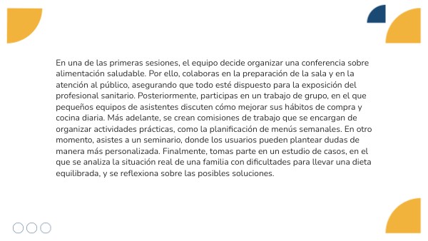 En la siguiente fase del programa, se utilizan distintos medios audiovisuales para reforzar el aprendizaje. Ayudas a preparar una proyección con imágenes y vídeos explicativos sobre higiene personal y prevención de enfermedades. Durante la actividad, colaboras en la organización técnica del material y observas cómo la utilización de recursos visuales aumenta la atención y la comprensión de los asistentes. Sin embargo, también identificas algunas limitaciones, como las dificultades de personas mayores para seguir el ritmo de los vídeos o los problemas técnicos que pueden surgir. Este ejercicio te permite valorar las características, ventajas e inconvenientes de cada medio, entendiendo que la elección adecuada depende tanto de los contenidos como del perfil del grupo.