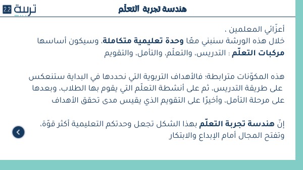 ، أعزّائي المعلمين خلال هذه الورشة سنبني معًا وحدة تعليمية متكاملة، وسيكون أساسها مركبات التعلّم : التدريس، والتعلّم، والتأمل، والتقويم هذه المكوّنات مترابطة؛ فالأهداف التربوية التي نحددها في البداية ستنعكس على طريقة التدريس، ثم على أنشطة التعلّم التي يقوم بها الطلاب، وبعدها على مرحلة التأمل، وأخيرًا على التقويم الذي يقيس مدى تحقق الأهداف إنّ هندسة تجربة التعلّم بهذا الشكل تجعل وحدتكم التعليمية أكثر قوّة، وتفتح المجال أمام الإبداع والابتكار
