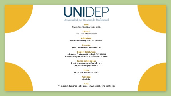Sede: Ciudad del Carmen, Campeche. Carrera: Comercio internacional. Asignatura: Desarrollo de negocios en america. Docente: Alberto Alexander Trejo Puerto. Nombre del alumno: Luis Angel Contreras Monsivais (52242016) Dayana Margarita Azuara Martínez (52233045) Correo institucional: lcontrerasmonsivais@gmail.com dayazuara09@gmail.com Fecha: 28 de septiembre del 2025. Actividad: Genially. Tema: Procesos de Integración Regional en América Latina y el Caribe