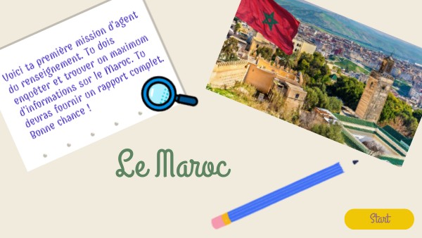Voici ta première mission d'agent du renseignement. Tu dois enquêter et trouver un maximum d'informations sur le Maroc. Tu devras fournir un rapport complet. Bonne chance !