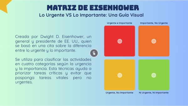 Creada por Dwight D. Eisenhower, un general y presidente de EE. UU., quien se basó en una cita sobre la diferencia entre lo urgente y lo importante. Se utiliza para clasificar las actividades en cuatro categorías según la urgencia y la importancia. Esta técnicas ayuda a priorizar tareas críticas y evitar que posponga tareas vitales pero no urgentes.
