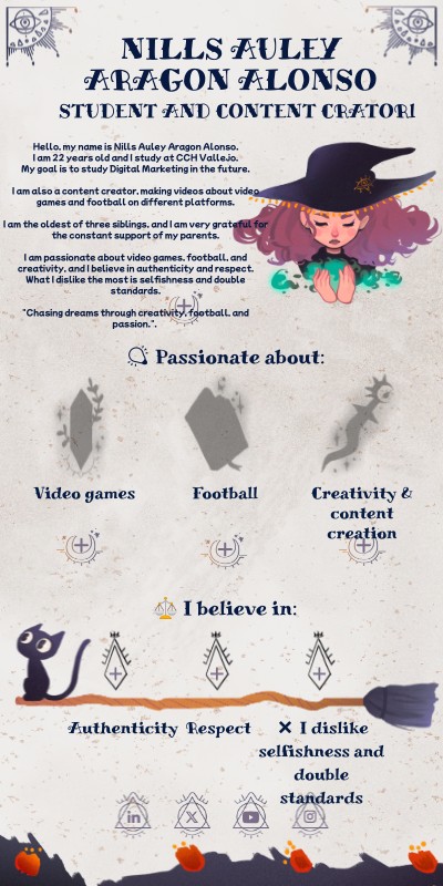 Hello, my name is Nills Auley Aragon Alonso.I am 22 years old and I study at CCH Vallejo. My goal is to study Digital Marketing in the future. I am also a content creator, making videos about video games and football on different platforms. I am the oldest of three siblings, and I am very grateful for the constant support of my parents. I am passionate about video games, football, and creativity, and I believe in authenticity and respect. What I dislike the most is selfishness and double standards. "Chasing dreams through creativity, football, and passion.".