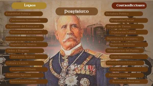 El Porfiriato fue el periodo de México en el que Porfirio Díaz gobernó de forma casi continua entre 1876 y 1911. Se caracterizó por la estabilidad política y la modernización bajo el lema de “Orden y Progreso”, con la construcción de ferrocarriles, el impulso a la minería, el crecimiento del comercio exterior y la introducción de nuevas tecnologías. Sin embargo, estos avances beneficiaron principalmente a una élite nacional y extranjera, mientras la mayoría de campesinos y obreros vivían en pobreza y bajo represión. Fue una etapa de grandes contrastes que terminó provocando el descontento social y político que desembocó en la Revolución Mexicana.