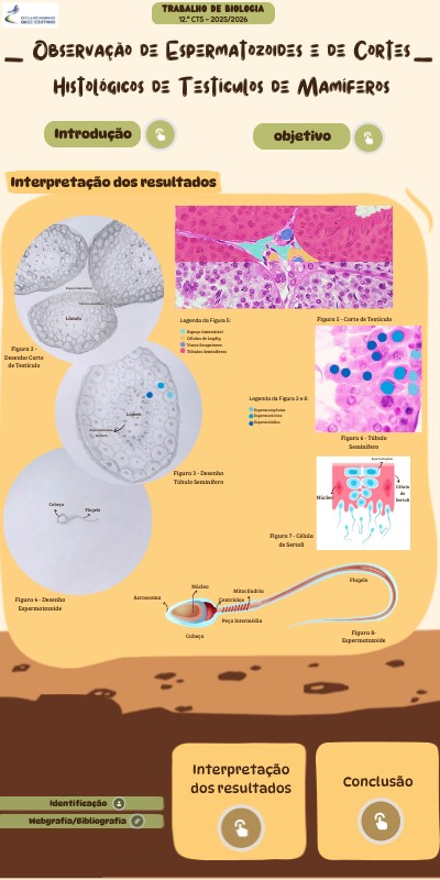 Nesta atividade prática, foram observados cortes histológicos de testículos de mamíferos e possibilitou o melhor entendimento do sistema reprodutor masculino. A análise microscópica permite identificar as diferentes etapas do desenvolvimento das células germinativas, desde as espermatogónias até aos espermatozoides maduros. Ao observar as diferentes células, conseguimos distinguir as diferentes fases da espermatogénese (Multiplicação; Crescimento; Maturação; Diferenciação) A fase de multiplicação inicia-se nas espermatogónias, células germinativas da periferia dos túbulos seminíferos, que sofrem divisão mitótica; metade destas continua a dividir-se e a outra avança de fase. Na fase de crescimento verifica-se um aumento do volume celular, formando espermatócitos primários. Durante a maturação, os espermatócitos primários (2n) passam pela divisão meiótica, dando origem a espermatócitos secundários (n), que em seguida, cada um desses gerará quatro espermatídios geneticamente diferentes, dado ao crossing-over (que ocorre na Prófase da primeira divisão da meiose e que diz respeito à troca reciproca de porções de cromatídeos entre os cromossomas homólogos) e à segregação independente dos cromossomas homólogos na Anáfase da primeira divisão e dos cromatídeos-irmãos, na Anáfase da segunda divisão da meiose. Na espermiogénese, os espermatídios dirigem-se para o lúmen dos túbulos seminíferos e alteram-se até se assemelharem a espermatozoides: com cabeça, acrossoma; peça intermédia e flagelo (porém, através do Microscópio Ótico Composto só conseguimos verificar a existência da cabeça e do flagelo). Essas mudanças são cruciais para que se movimentem facilmente para os epidídimos. Ainda no interior dos túbulos seminíferos, foi possível identificar células de Sertoli protetoras e segregadoras de líquido rico em hormonas que desenvolve e nutre os espermatozoides. Já as células de Leydig, presentes nos seus espaços intersticiais, estão encarregues da produção de testosterona. Como os túbulos seminíferos se encontram extremamente enrolados, é possível a produção de um maior número de espermatozoides num órgão de pequena dimensão. A estrutura dos testículos, com a presença das células de Sertoli e das células de Leydig, demonstra a complexidade e a regulação hormonal envolvida na produção e maturação dos gâmetas.