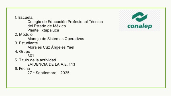 1. Escuela: Colegio de Educación Profesional Técnica del Estado de México Plantel Ixtapaluca 2. Modulo Manejo de Sistemas Operativos 3. Estudiante Morales Cuz Ángeles Yael 4. Grupo 301 5. Titulo de la actividad EVIDENCIA DE LA A.E. 1.1.1 6. Fecha 27 - Septiembre - 2025