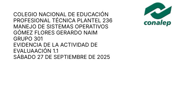 COLEGIO NACIONAL DE EDUCACIÓN PROFESIONAL TÉCNICA PLANTEL 236MANEJO DE SISTEMAS OPERATIVOS GÓMEZ FLORES GERARDO NAIM GRUPO 301 EVIDENCIA DE LA ACTIVIDAD DE EVALUAACIÓN 1.1 SÁBADO 27 DE SEPTIEMBRE DE 2025