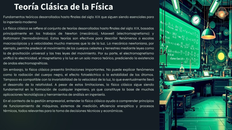 Fundamentos teóricos desarrollados hasta finales del siglo XIX que siguen siendo esenciales para la ingeniería moderna La física clásica se refiere al conjunto de teorías desarrolladas hasta finales del siglo XIX, basadas principalmente en los trabajos de Newton (mecánica), Maxwell (electromagnetismo) y Boltzmann (termodinámica). Estas teorías son efectivas para describir fenómenos a escalas macroscópicas y a velocidades mucho menores que la de la luz. La mecánica newtoniana, por ejemplo, permite predecir el movimiento de los cuerpos celestes y terrestres mediante leyes como la de gravitación universal y las tres leyes del movimiento. Por su parte, el electromagnetismo unificó la electricidad, el magnetismo y la luz en un solo marco teórico, prediciendo la existencia de ondas electromagnéticas. Sin embargo, la física clásica presenta limitaciones importantes. No puede explicar fenómenos como la radiación del cuerpo negro, el efecto fotoeléctrico o la estabilidad de los átomos. Tampoco es compatible con la invariabilidad de la velocidad de la luz, lo que eventualmente llevó al desarrollo de la relatividad. A pesar de estas limitaciones, la física clásica sigue siendo fundamental en la formación de cualquier ingeniero, ya que constituye la base de muchas aplicaciones tecnológicas y herramientas de análisis en ingeniería. En el contexto de la gestión empresarial, entender la física clásica ayuda a comprender principios de funcionamiento de máquinas, sistemas de medición, eficiencia energética y procesos térmicos, todos relevantes para la toma de decisiones técnicas y económicas.