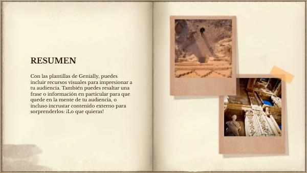 Con las plantillas de Genially podrás incluir recursos visuales para dejar a tu audiencia con la boca abierta. También destacar alguna frase o dato concreto que se quede grabado a fuego en la memoria de tu público e incluso embeber contenido externo que sorprenda: vídeos, fotos, audios... ¡Lo que tú quieras!