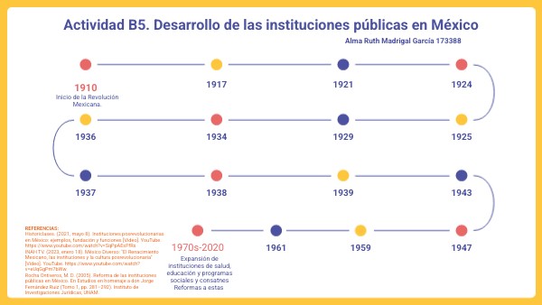REFERENCIAS:Historiclases. (2021, mayo 8). Instituciones posrevolucionarias en México: ejemplos, fundación y funciones [Video]. YouTube. https://www.youtube.com/watch?v=SqPpAEsFfRs INAH TV. (2023, enero 18). México Diverso: "El Renacimiento Mexicano, las instituciones y la cultura posrevolucionaria" [Video]. YouTube. https://www.youtube.com/watch?v=eUqGgPm7bWw Rocha Ontiveros, M. D. (2005). Reforma de las instituciones públicas en México. En Estudios en homenaje a don Jorge Fernández Ruiz (Tomo 1, pp. 281–292). Instituto de Investigaciones Jurídicas, UNAM.