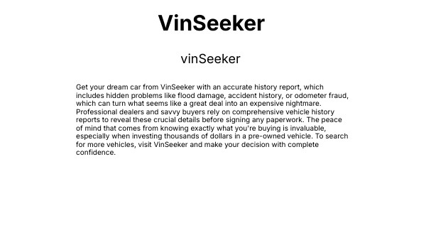 Get your dream car from VinSeeker with an accurate history report, which includes hidden problems like flood damage, accident history, or odometer fraud, which can turn what seems like a great deal into an expensive nightmare. Professional dealers and savvy buyers rely on comprehensive vehicle history reports to reveal these crucial details before signing any paperwork. The peace of mind that comes from knowing exactly what you're buying is invaluable, especially when investing thousands of dollars in a pre-owned vehicle. To search for more vehicles, visit VinSeeker and make your decision with complete confidence.