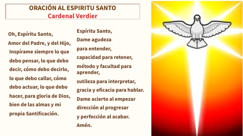 Espíritu Santo, Dame agudeza para entender, capacidad para retener, método y facultad para aprender, sutileza para interpretar, gracia y eficacia para hablar. Dame acierto al empezar dirección al progresar y perfección al acabar. Amén.