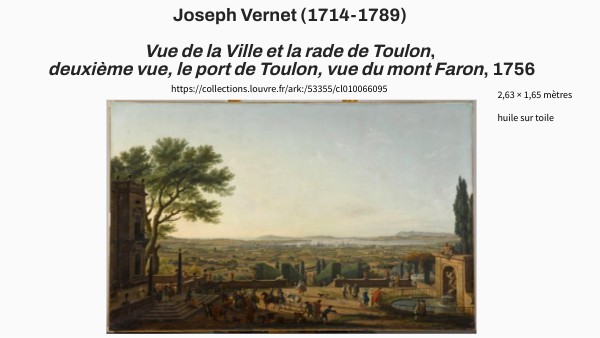 Vue de la ville et de la rade de Toulon « Cette vue est prise d'une Maison de Campagne à mi-côte de la Montagne qui est derriere la Ville. On y a représenté les amusemens des habitans, et les voitures dont ils se servent pour aller aux Maisons de Campagnes, qu'on nomme Bastides. L'heure du jour est le matin ». Livret du Salon de 1757, l'oeuvre de Joseph Vernet porte le numéro 59. Cette description a été rédigée par l'artiste lui-même