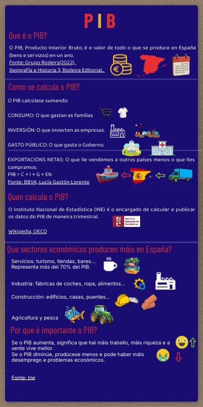 O PIB, Producto Interior Bruto, é o valor de todo o que se produce en España (bens e servizos) en un ano.Fonte: Grupo Rodeira(2022), Xeografía e Historia 3, Rodeira Editorial..