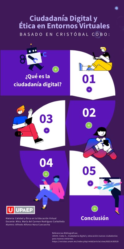 He aprendido que la ciudadanía digital va mucho más allá de saber utilizar la tecnología: implica comprender derechos, responsabilidades y la necesidad de actuar con ética en cada interacción en los entornos virtuales. En el artículo y en la entrevista a Juan Cristóbal Cobo se subraya que la educación digital no puede limitarse a trasladar contenidos al formato en línea, sino que requiere un cambio profundo en las prácticas pedagógicas y en la cultura de quienes participan. La ciudadanía digital supone aprender a cuestionar críticamente la información, cuidar la privacidad, respetar a los demás y usar la tecnología con un propósito claro y constructivo. También me queda claro que la brecha digital, el ciberacoso, la desinformación y el mal uso de los datos son retos urgentes que solo se enfrentan con responsabilidad compartida. La ética debe ser el eje de cualquier estrategia educativa y tecnológica, ya que define cómo convivimos, aprendemos y participamos en lo digital. En conclusión, ser ciudadano digital no significa solo tener acceso a internet o redes sociales, sino asumir un compromiso consciente y responsable con la manera en que usamos la tecnología, para construir un entorno más justo, seguro e inclusivo.