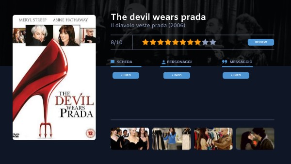 Regista: DAVID FRANKELPaese e anno di produzione: USA; 2006 Durata: 109 minuti Cast principale: Meryl Streep, Anne Hathaway, Emily Blunt, Stanlet Tuci, Simon Baker Genere: commedia drammatica Linguaggio: il narratore è esterno, montaggio ha un ritmo alternato, effetti speciali assenti, riprese alternano tra spazi aperti e chiusi.