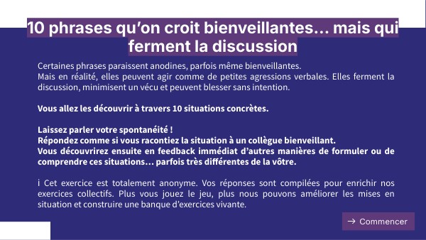 Certaines phrases paraissent anodines, parfois même bienveillantes. Mais en réalité, elles peuvent agir comme de petites agressions verbales. Elles ferment la discussion, minimisent un vécu et peuvent blesser sans intention. Vous allez les découvrir à travers 10 situations concrètes. Laissez parler votre spontanéité ! Répondez comme si vous racontiez la situation à un collègue bienveillant. Vous découvrirez ensuite en feedback immédiat d’autres manières de formuler ou de comprendre ces situations… parfois très différentes de la vôtre. ℹ️ Cet exercice est totalement anonyme. Vos réponses sont compilées pour enrichir nos exercices collectifs. Plus vous jouez le jeu, plus nous pouvons améliorer les mises en situation et construire une banque d’exercices vivante.